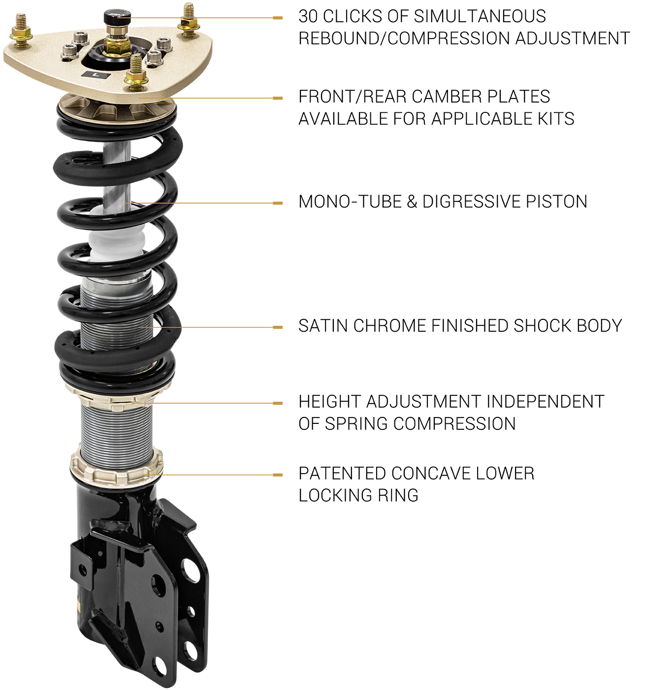 The DH series coilover kits are supplied with aluminium camber adjustable pillowball top mounts on the front (where available) and pillowball only on the rear or no top mounts.